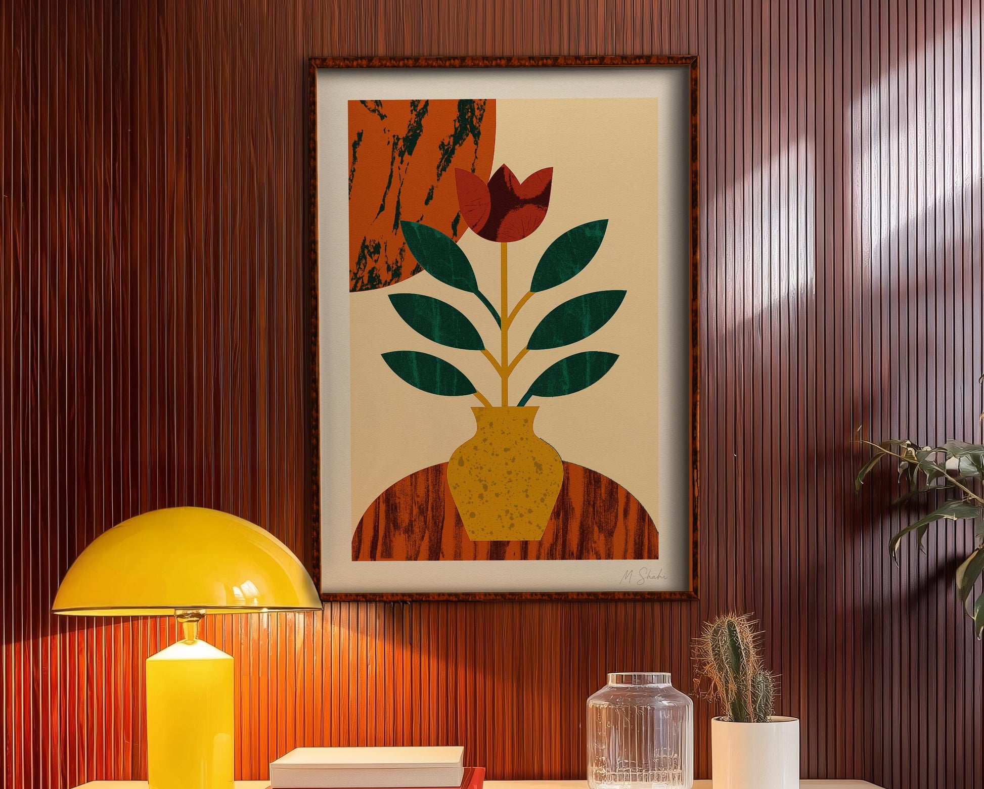 Golden Vase Art Print: Mid-Century Modern Botanical Giclée